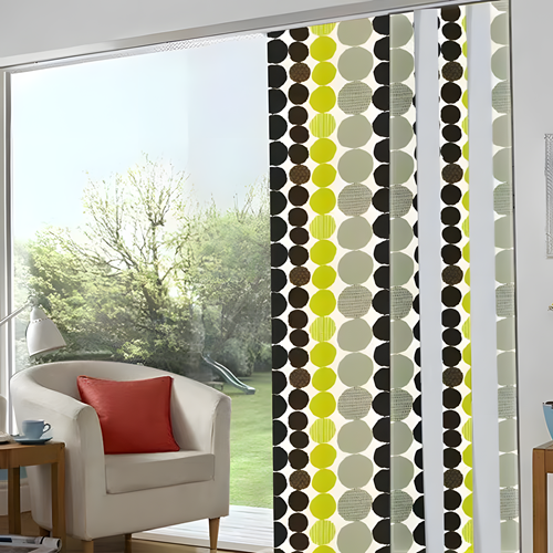 Designer pattern extendable panel glide blinds in Earthy Tone Dots, featuring 100% blockout fabric, soft natural tones and smooth sliding panels – perfect for modern living rooms, bedrooms and sliding doors. |