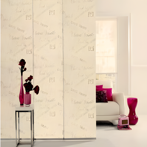 1920’s Antique panel glide blinds blend vintage elegance with modern functionality, featuring premium blockout printed fabric and a smooth extendable track ideal for wide windows and sliding doors. |